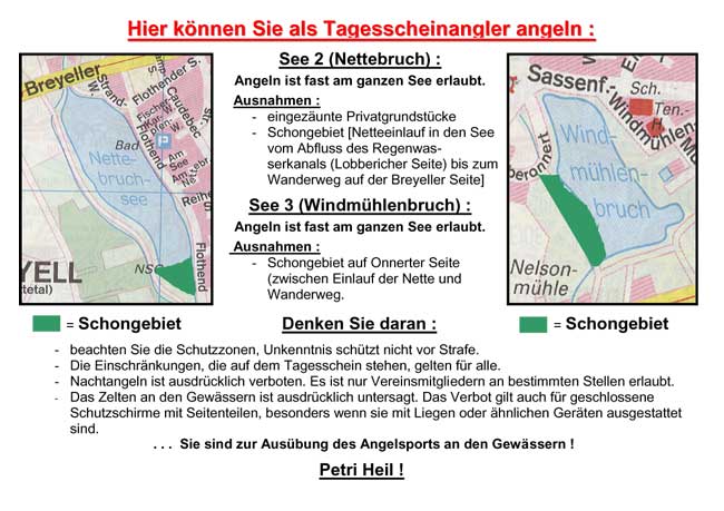 Gastangler können ausschließlich am Nettebruch sowie dem Windmühlenbruch angeln,der BreyellerSee und das Baggerloch sind den Vereinsmitgliedern vorbehalten.